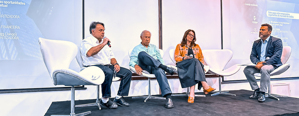 João Ribeiro da Silva (Confiance Securitizadora), Simone Lazari (OS Inteligência Financeira) e Alexandre Ornelas (Progresso Securitizadora), que compartilharam visões experientes e resilientes diante de um cenário desafiador.